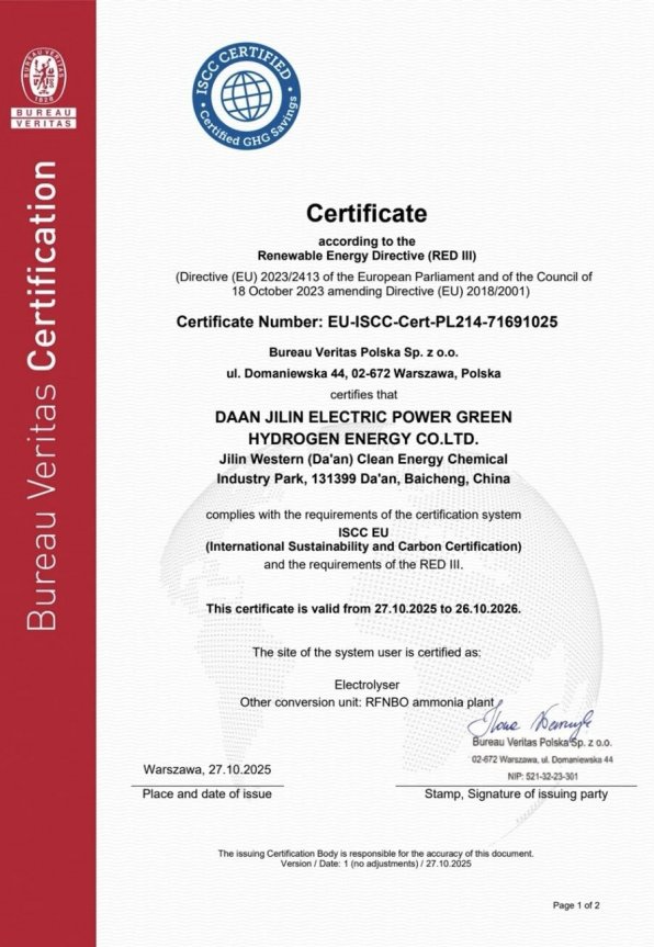 “ISCC EU RFNBO ”認(rèn)證作為可再生燃料非生物來源氨的認(rèn)證體系,覆蓋原料、生產(chǎn)、應(yīng)用全生命周期評(píng)估,其嚴(yán)苛標(biāo)準(zhǔn)成為國際綠色能源領(lǐng)域的“通行證”。大安項(xiàng)目通過認(rèn)證,意味著綠氨生產(chǎn)技術(shù)、管理體系和碳核算標(biāo)準(zhǔn),全面滿足歐盟《可再生能源指令》(REDⅢ)要求。