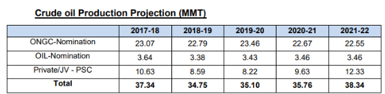 同樣,第二大生產(chǎn)國(guó)印度石油的產(chǎn)量有限公司(OIL)將從2017 - 18年的約3.64噸下降5%至2021 - 2022年的3.46噸。私營(yíng)和合資企業(yè)(JVs)經(jīng)營(yíng)的油田原油產(chǎn)量將從上一財(cái)年的10.63噸增加到2021 - 2022年的12.33噸。